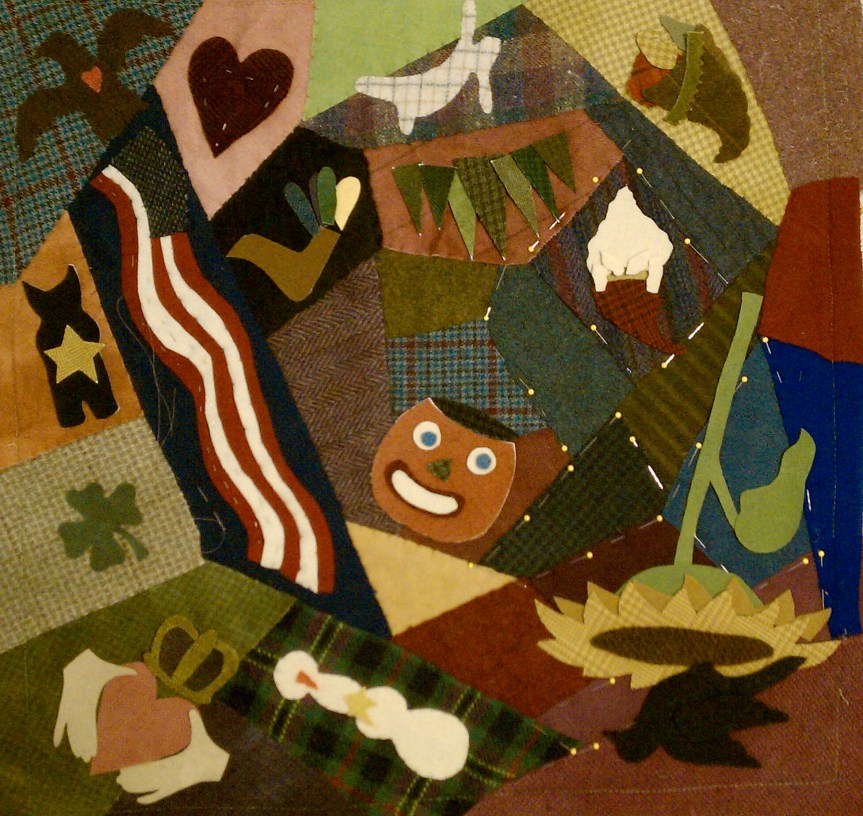 Here is the “refined” layout. I added in some darker backgrounds and settled on the final placement of my main appliques. For the center area, I plan to embroider a big bunch of flowers in the jack-o-lantern and maybe add some bats, candy, etc.