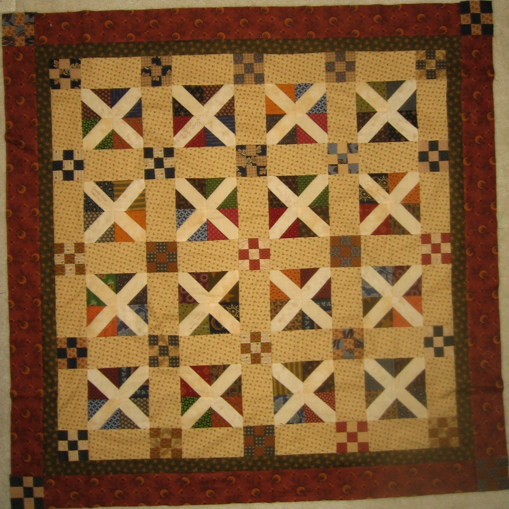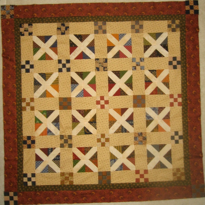 This is a fun quilt to make from your scraps.  The signature X blocks are very easy to make – you cut out the squares of cream fabric, sew a square of colored fabric to the opposite corners, press open, and then trim off the excess.  You do have lots of little triangle scraps, but they are perfect for miniature quilts or to create small blocks for pin cushions.