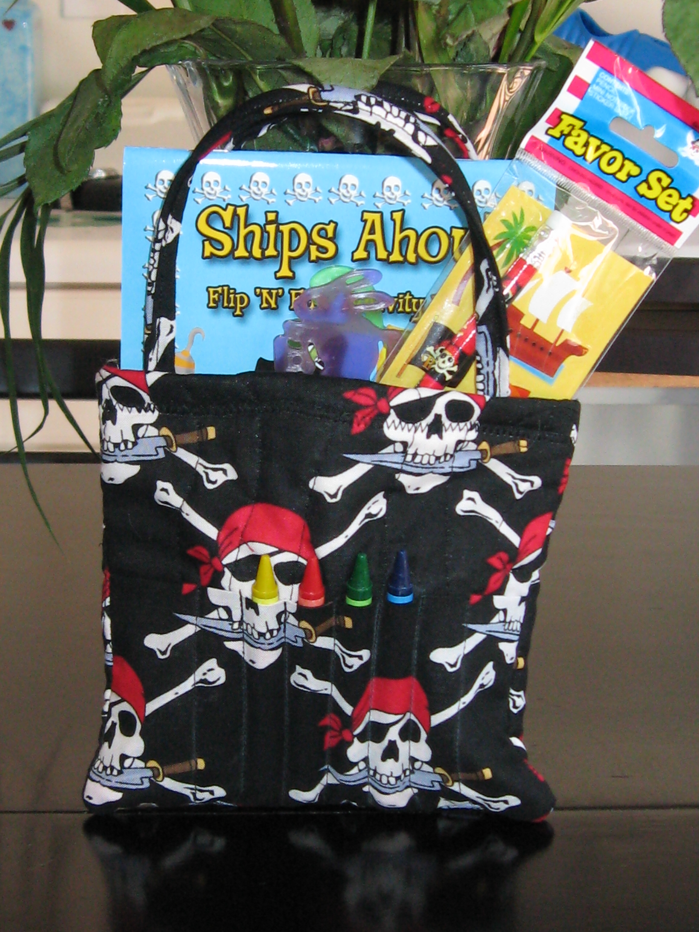 This first favor is one I made for my son’s Pirate themed party. The pattern is the Child’s Coloring Bag from Clothesline Quilts. What’s great about these bags is they don’t take up a lot of fabric and you can easily make 8 in about 90 minutes (which includes the time to quilt the fabric). Next, go to the Dollar Tree and pick out some crayons and other little things to go inside!