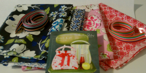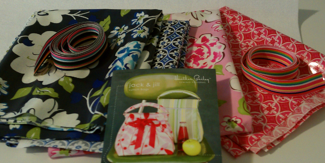 The first project is a gifts for my son’s teachers.  His last day of school is on Friday and I want to give them something special to thank them for all they’ve done this year.  Every teacher needs a lunch bag, and Heather Bailey’s Jack and Jill pattern is the perfect one!  I’m using laminated cotton fabrics for this project, which is something I’ve been looking forward to trying  — I’ll let you know how it goes.  One teacher gets a blue bag and the other gets a pink one!