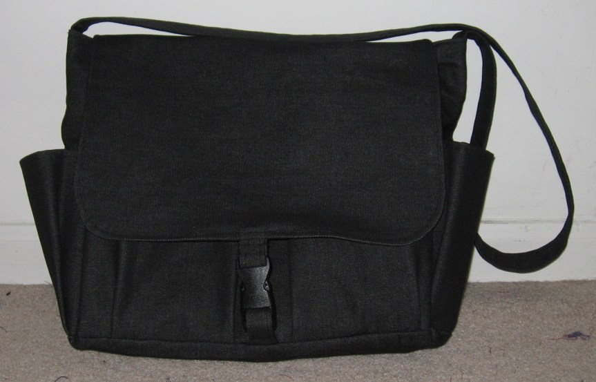This is a messenger bag I made for my husband. This is my own pattern – but I was inspired by the bag Jack Bauer carries on “24.” It’s hard to find a basic bag that a man would carry, so that’s why I designed my own. I used Black Canvas for the outside and a lightweight black cotton for the lining.