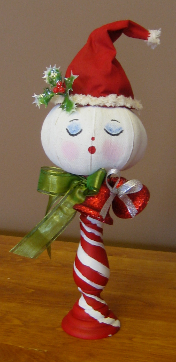 This last one is my favorite one since it looks so different from the other ones. I knew I didn’t her to have an antique look – I wanted to keep this one more retro. I thought about adding the Santa hat when trying to think of another type of hat that wasn’t as involved as a top hat or bonnet. When the hat was placed on her head, she reminded me of a candy cane! This inspired me to paint her candlestick a cheery red and white. I just need to figure out a better way to paint on the white lines so they don’t look as wobbly. Any suggestions are welcome!