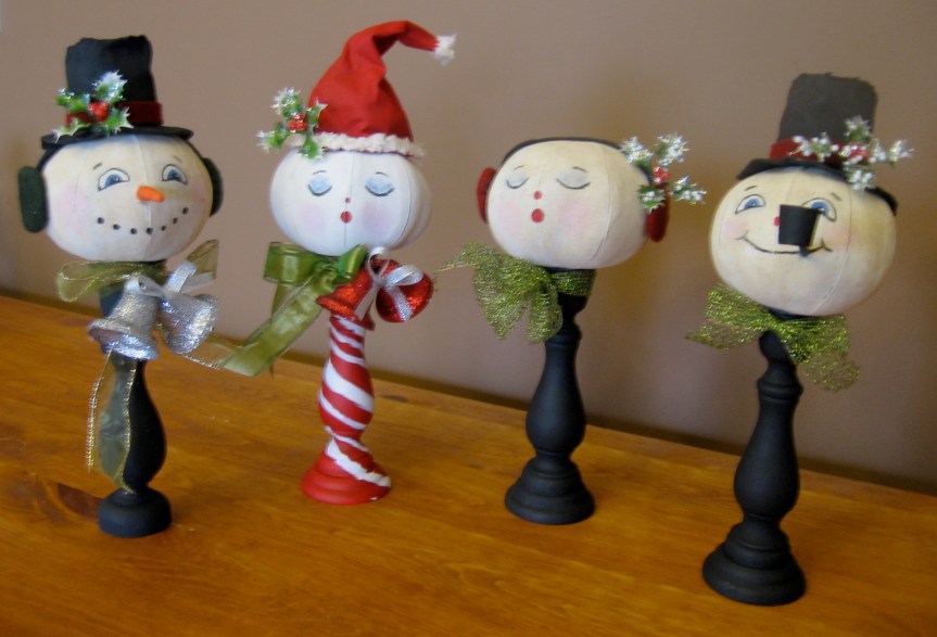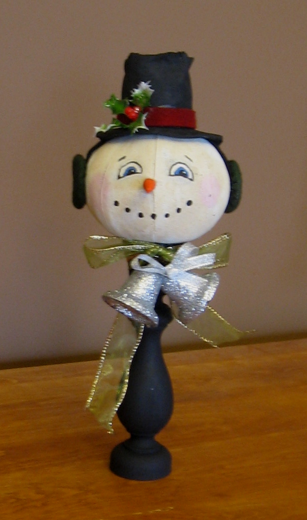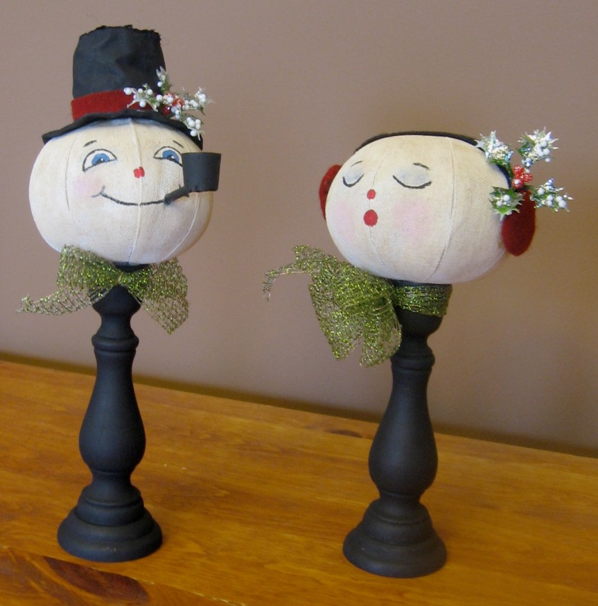 The first set was a snowman and wife. The top hat was made out of muslin and then painted black. The ears muffs were created from wool yo-yos and a strip of wool. After the headgear was glued on, they were painted with a coffee wash to lend an antique look.