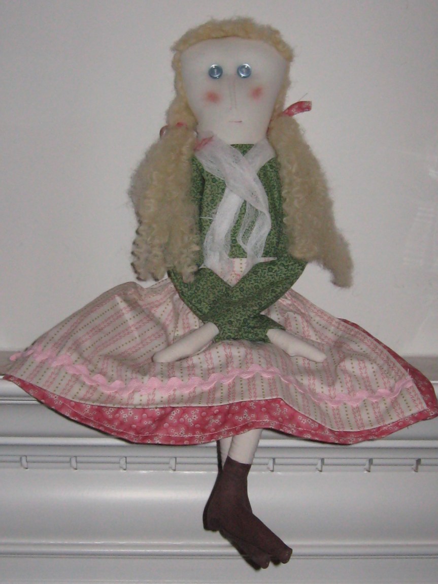 Here is my first attempt at making a primitive doll – Miss Emily. I made her in cottage style fabrics, so she doesn’t really look prim – but I like the general effect. I might end up staining her with a walnut crystals as she looks too clean :).