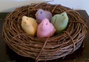 Here’s a cute spring project – a nest of Easter Peeps! The original pattern from Liberty Rose was a much larger chick that could be used for a pincushion. I downsized it and stitched it up in some yummy spring colors! You could also make some cute Easter Rabbits and use brown floss to add in the distinctive Rabbit Peep face – 2 small dots for the eyes and one for the nose (note: writing this on my to do list).