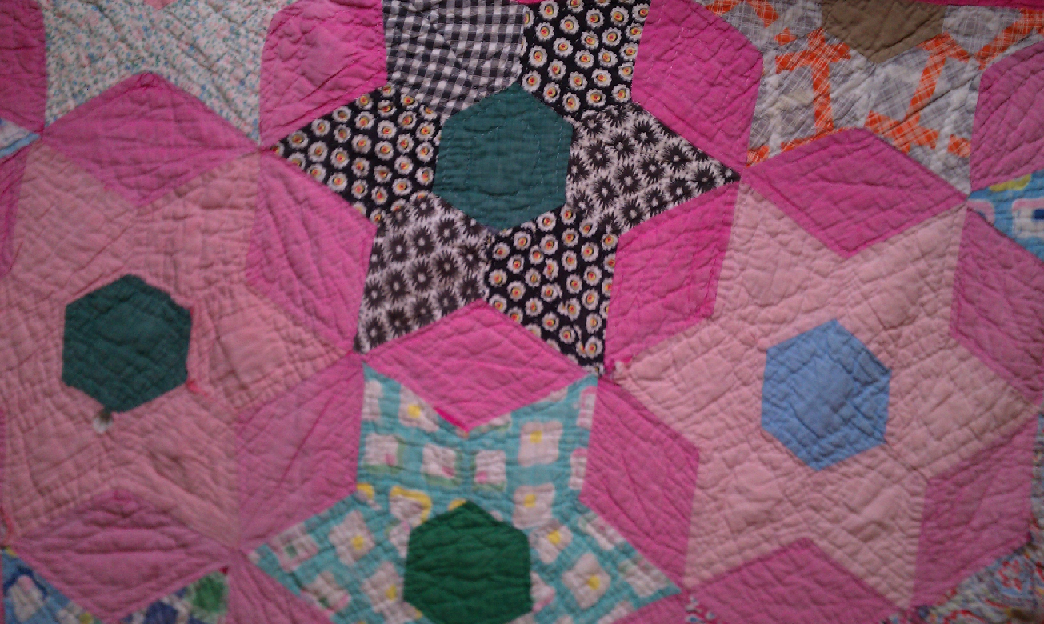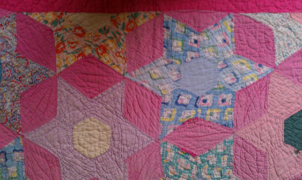 The first one is a old quilt I found at the local Goodwill! This is made of old feedsacks and features a pink border. There are a few holes here and there, but overall it is in good shape. Not sure what I will do with it yet, but it is a nice addition to my collection of old quilts.