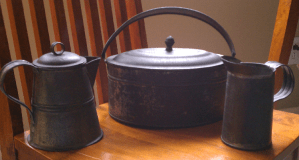 Next is a set of tin dishes I found at one of my regular thrift stores. The large pan with a lid is an old lunch pail – it reminds me of the lunch pail that Pa Ingalls used in Little House on the Prairie.