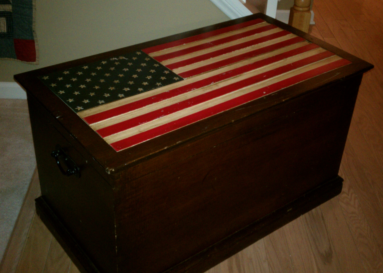The last thing is my most favorite find (sorry Barbara, you can’t have it!). It’s a vintage trunk with an American Flag carved into the top. There are 50 stars on the flag, so I assume it was made in the 1960’s. It is made of a nice heavy dark wood, and there is a tray inside that lifts out. Not sure where this is going yet, but I am sure my decorator (Liberty Rose) can help me figure it out!