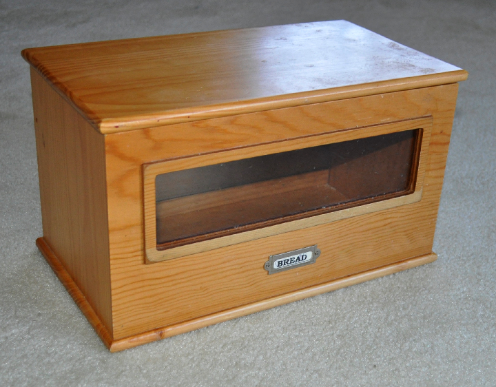 Here is a wooden bread box. It needs a bit of cleaning (there are crumbs in it), and I may end up painting/distressing this. It would make a perfect sewing box – especially since you can see your project through the window.