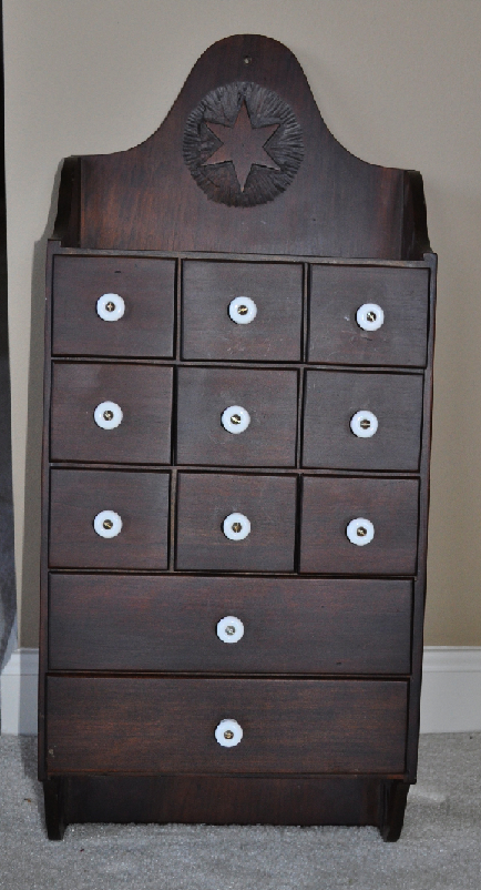 When I saw this piece with the handcarved star and the little drawers, I had to have it! According to the signature on the back, this was made in 1986, which makes it 26 years old – so it just qualifies as being vintage!