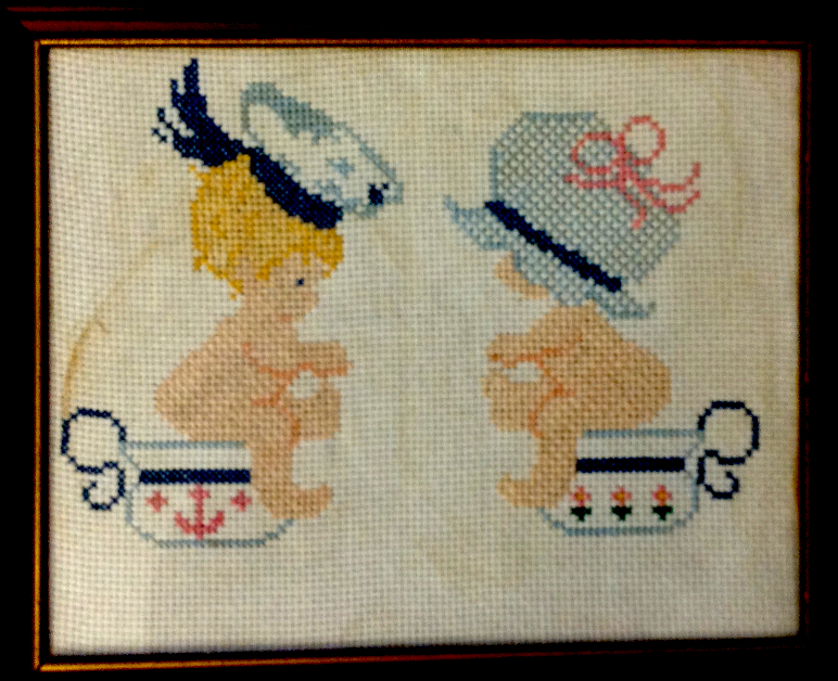 Here is another treasure I found, stitched by Pam Jersey in 1975. Her name is signed on the back of the frame. I’d like to get this cleaned, blocked, and re-framed and am tempted to find some vintage floss and stitch her name and date on the front. What do you think – is that cheating? This is going in my downstairs bathroom.