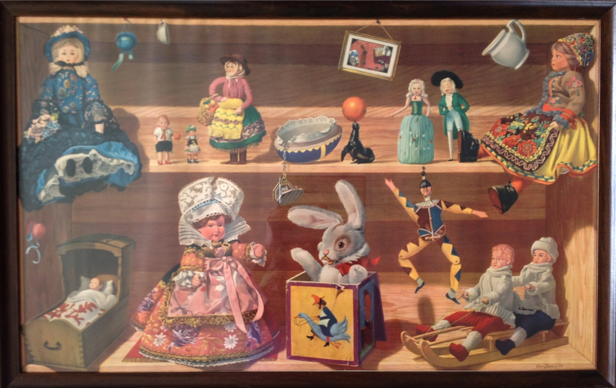 I’ve found some great picture at the thrift stores recently. The first one is a print from 1954 by Ken Davies called “Dearest Dolls”. From a bit of research, it seems as if this was a print commissioned by Family Circle magazine. This is painted in what is known as trompe-l’œil–painting something so realistic as to make it appear like it is actually a three dimensional object. All of his subjects involve some form of Americana and after looking at his website, I wish I could have a whole houseful of his paintings!