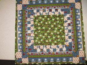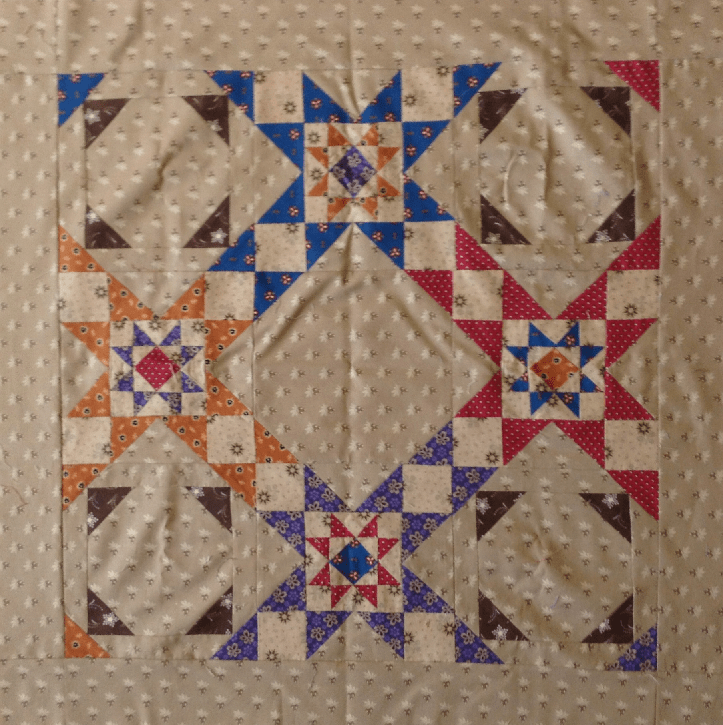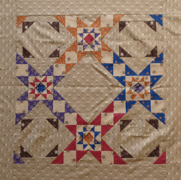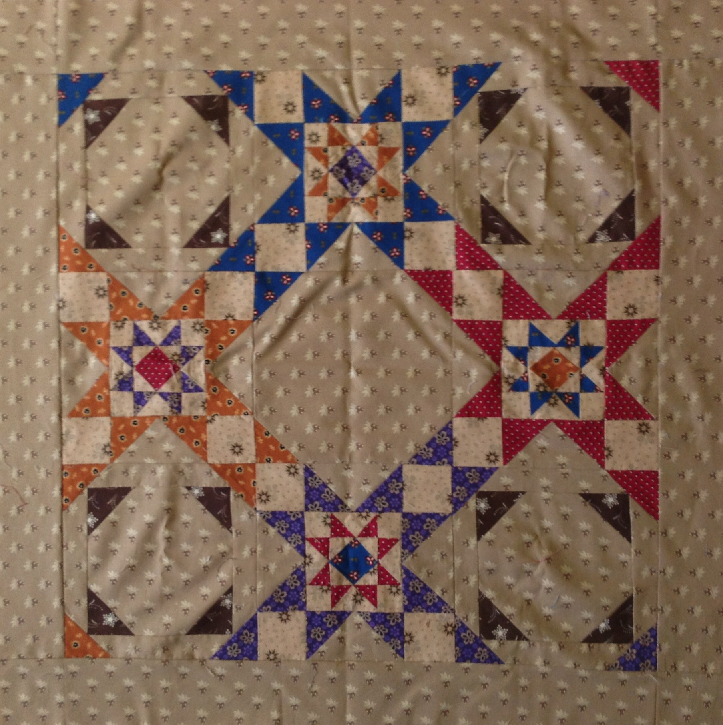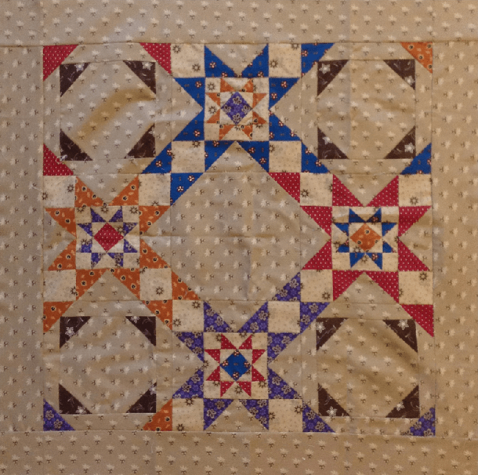 As you can see, I had three squares that weren’t in the correct place. This caused the small triangles in the upper middle to be mismatched with their appropriate color. The squares were ripped out and re-sewn, as that that seemed the easiest and quickest way to correct it. See below for the corrected version. Note, I have rotated it so that it is easier to compare the two.