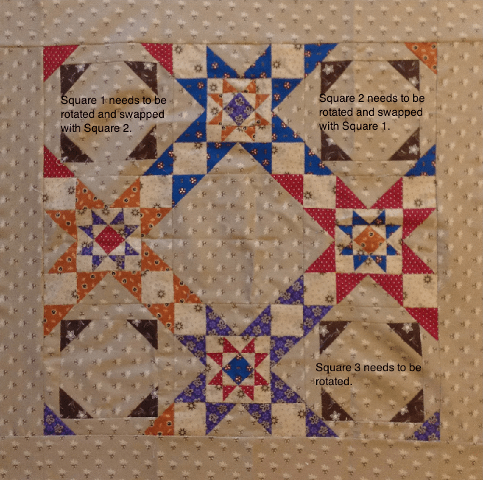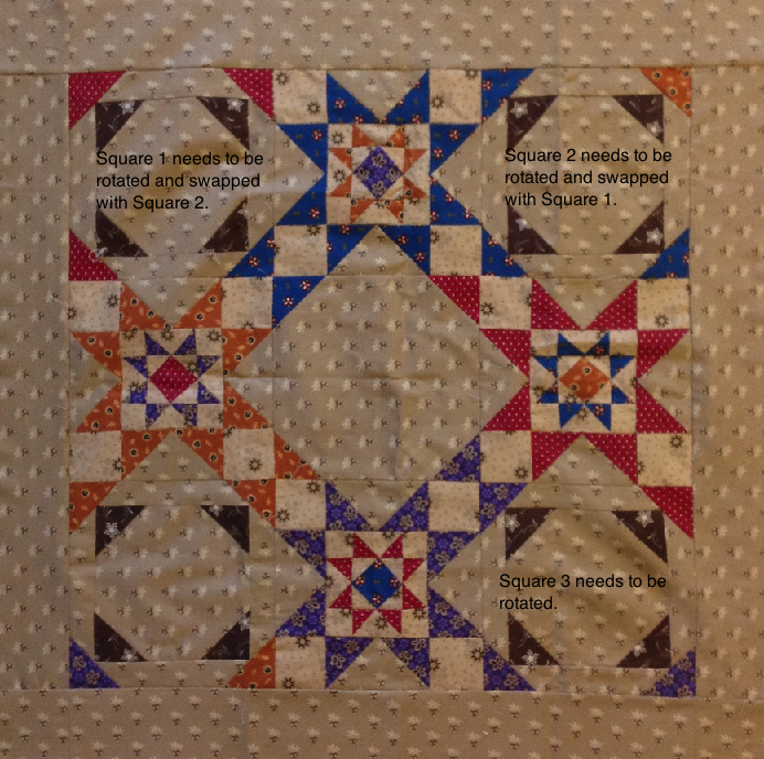 Update: Just realized I mis-labeled Square 3. Square three should be the square in the lower left corner. That one needs to be rotated so the purple triangle matches up correctly with the main design. Luckily I did this correctly when I actually fixed the quilt!