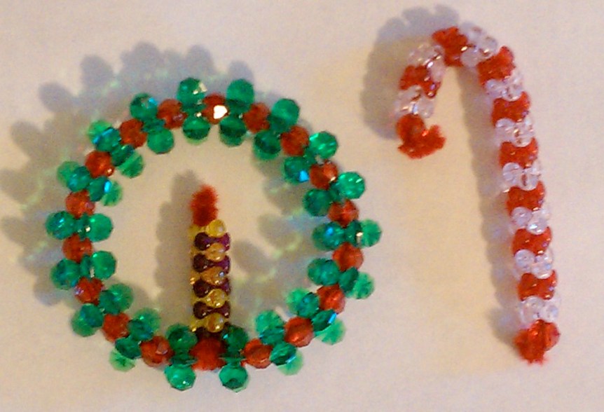 My son and I have been having fun making some beaded christmas ornaments.  I remember making ornaments like this when I was a kid and thought he was at the right age to have a lot of fun doing it.  I started out with something simple – a wreath and a candy cane.  These are simple and cheap to make, and you have the benefit of some great bonding time with your kids!