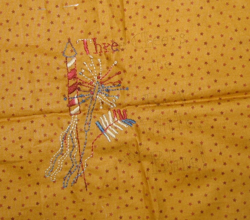 The second pillow is from a Crabapple Hill pattern (I think it was a freebie pattern she offered a long time ago). It is stitched with Red, White, and Blue perle cotton. I love the fireworks!