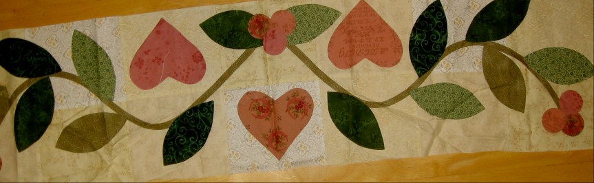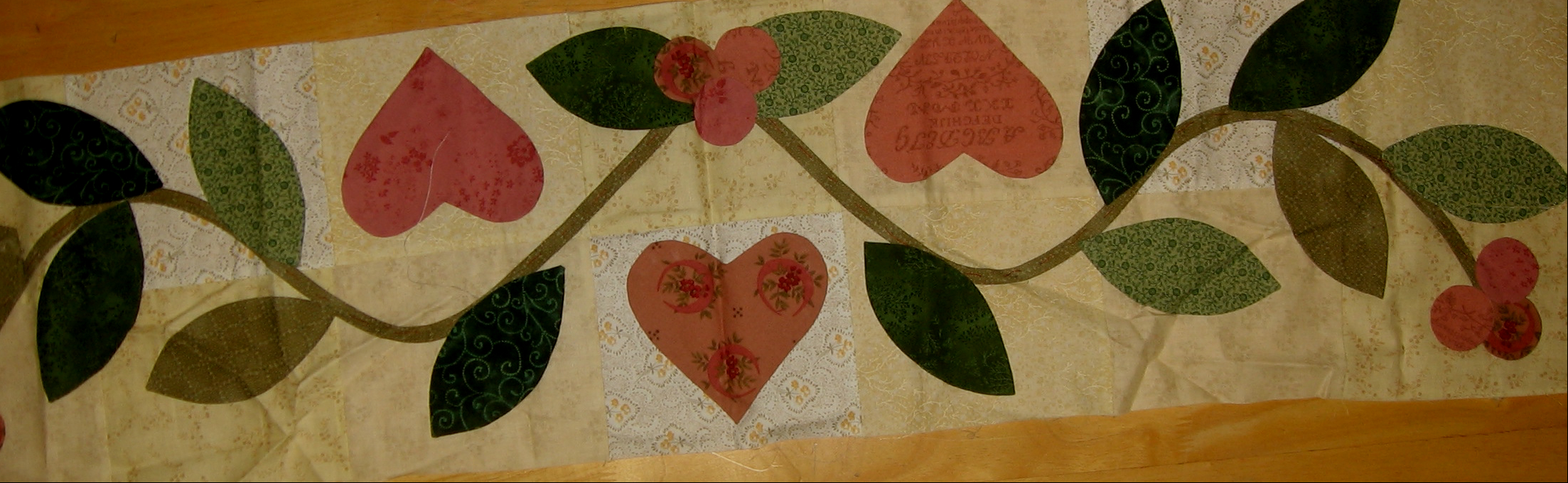 The Sweetheart Table Runner is my first attempt at applique. All the applique pieces are complete and basted down, I just need to sew around them, add a border, and then quilt it (it sounds so easy when I describe it).