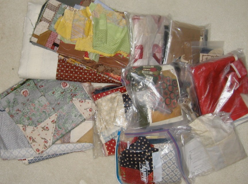 It’s only natural to take inventory of all your UFOs at the first of the year. You want to have an idea of how far you are behind – right? The interesting thing about UFOs, is that at the time they were started, they were the most exciting project ever and I couldn’t wait to finish them. Now, they just sit there, unfinished, like an albatross around my neck (perhaps that’s a bit dramatic). Here’s the stack of UFOs that are currently taking up space in my closet: